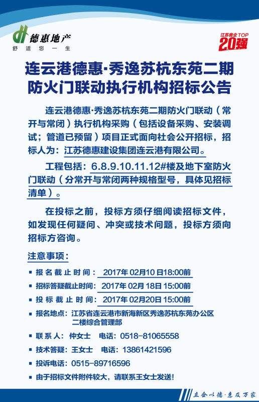 連云港秀逸蘇杭東苑二期防火門聯(lián)動(dòng)執(zhí)行機(jī)構(gòu)招標(biāo)公告及文件