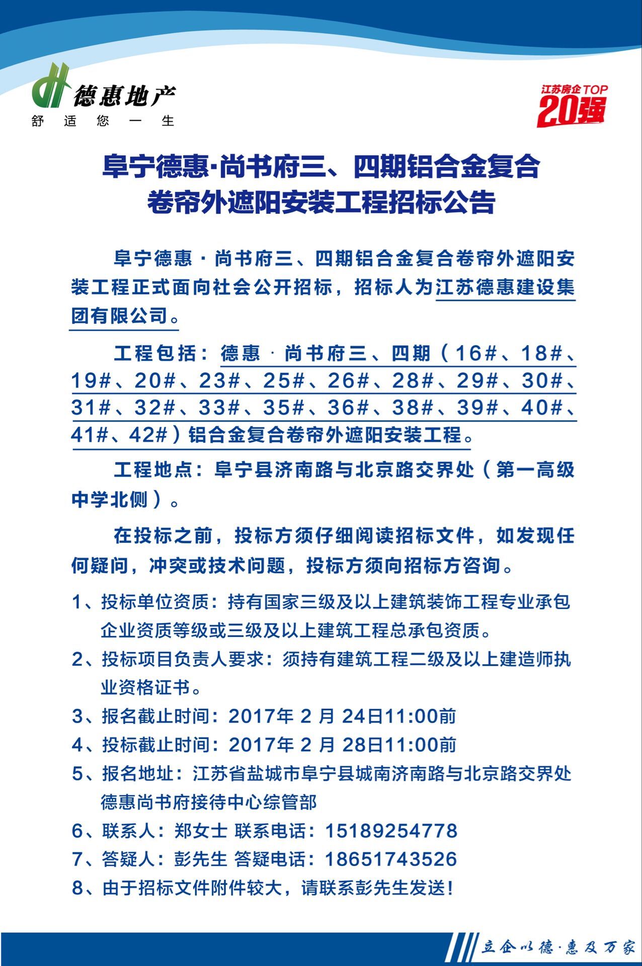 阜寧德惠尚書府三、四期鋁合金復合卷簾外遮陽安裝工程招標公告