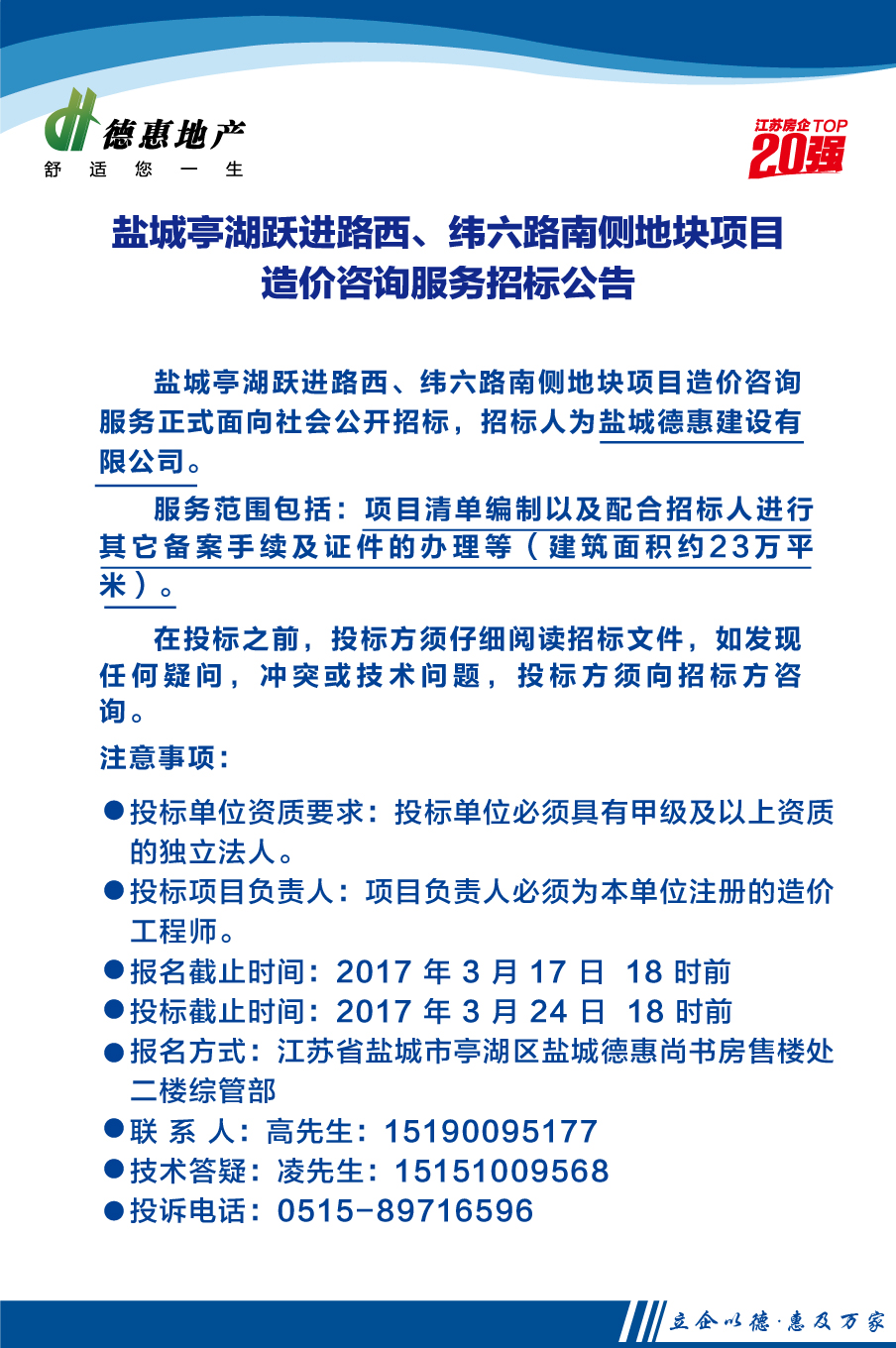 鹽城亭湖躍進(jìn)路西、緯六路南側(cè)地塊項目造價咨詢服務(wù)招標(biāo)公告