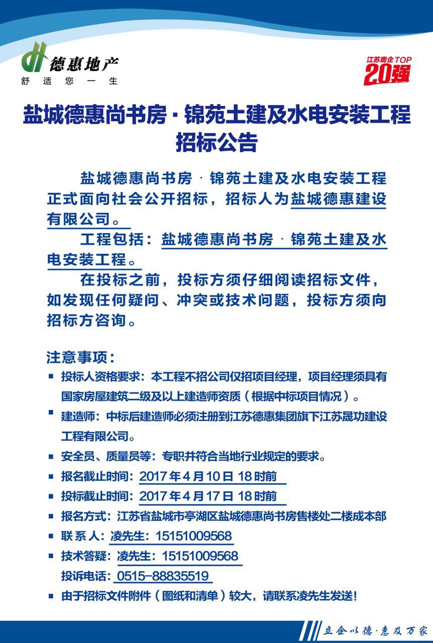 鹽城德惠尚書房•錦苑土建及水電安裝工程招標(biāo)公告