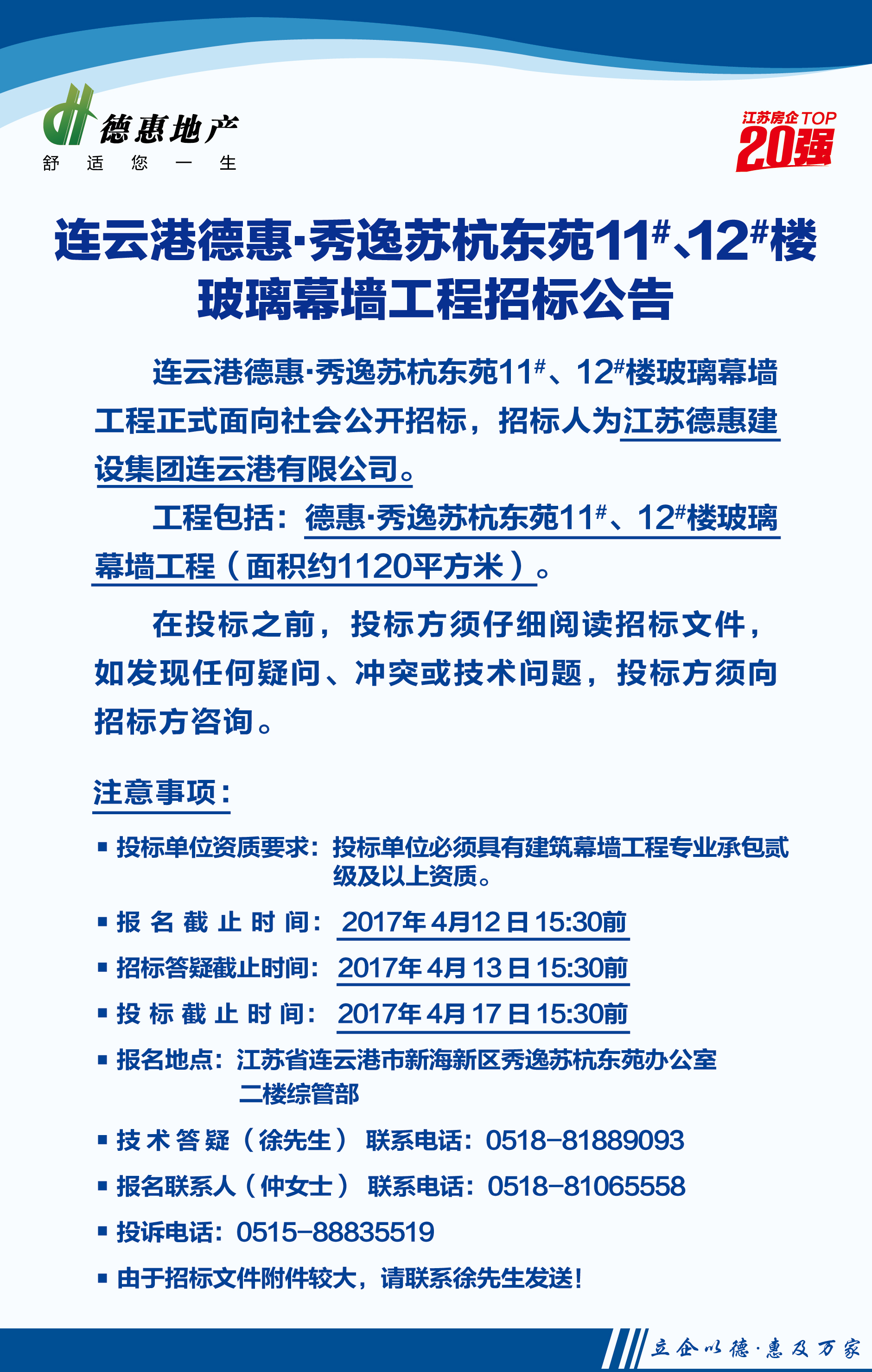 連云港德惠•秀逸蘇杭東苑11#、12#樓玻璃幕墻工程招標(biāo)公告