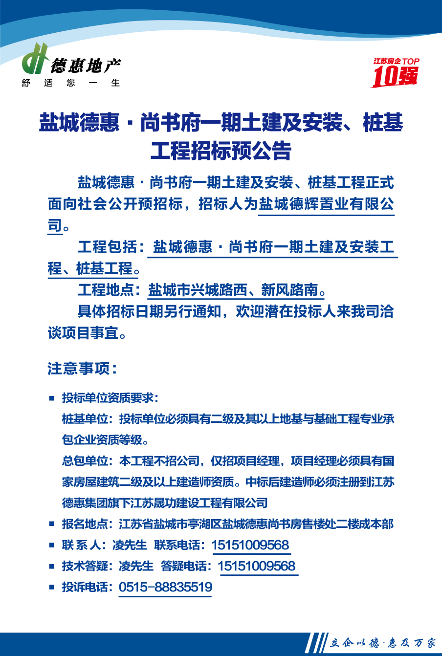 鹽城德惠·尚書府一期土建及安裝、樁基工程招標(biāo)預(yù)公告