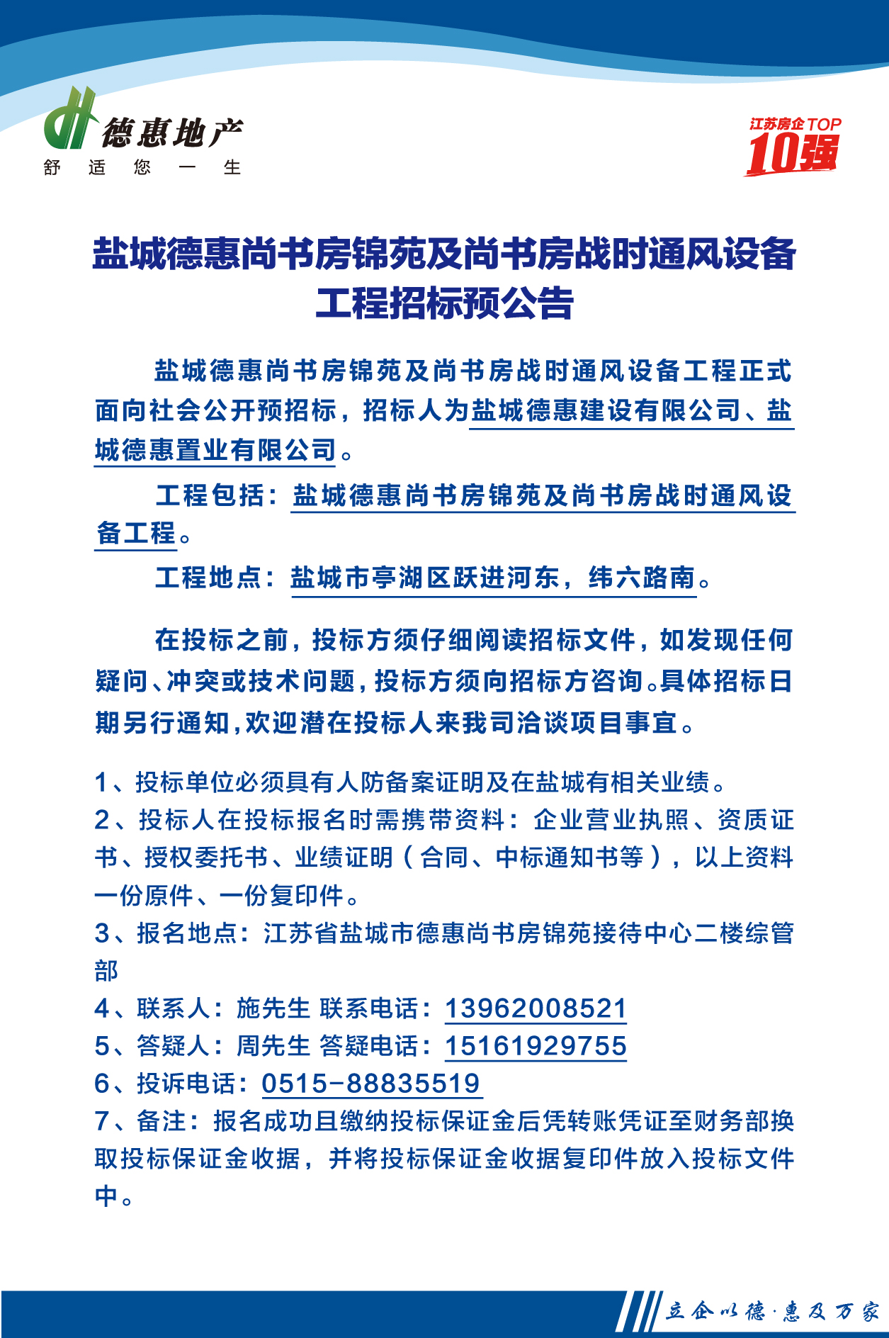 鹽城德惠·尚書房錦苑及尚書房戰(zhàn)時(shí)通風(fēng)設(shè)備工程招標(biāo)公告