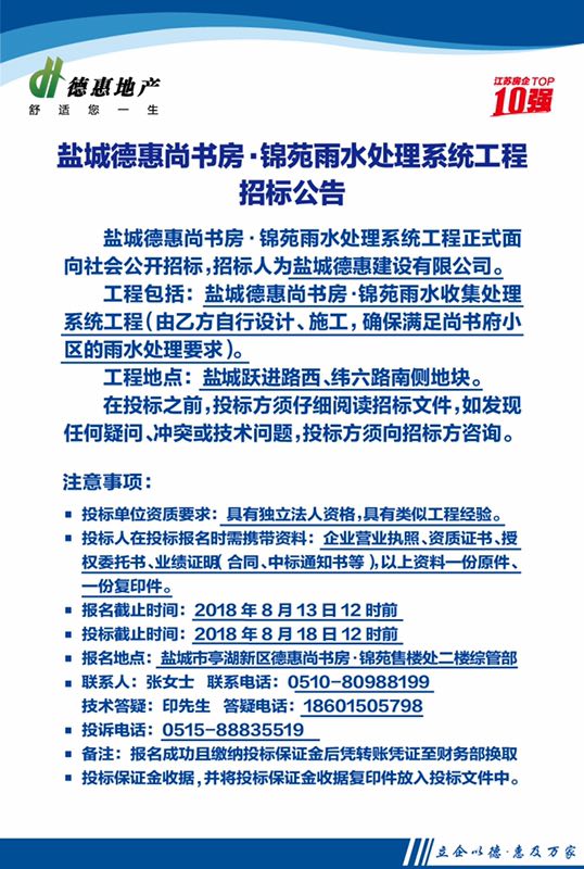 鹽城德惠尚書房•錦苑雨水處理系統(tǒng)工程招標(biāo)公告