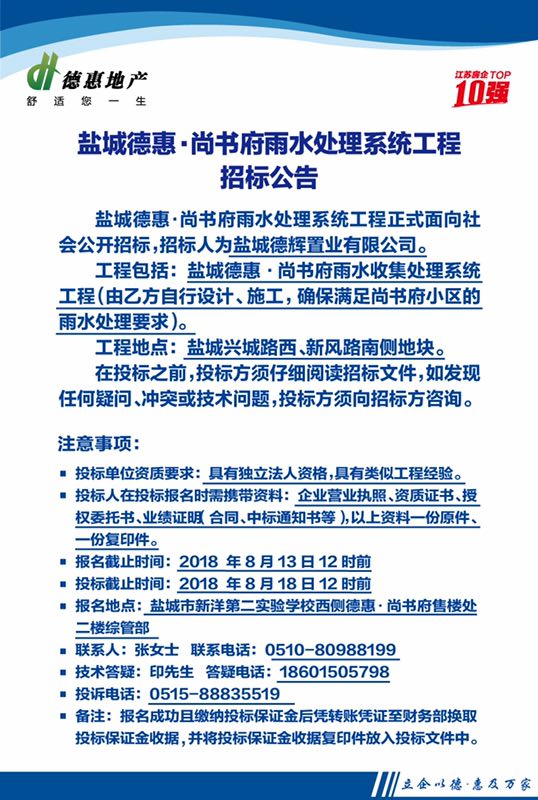 鹽城德惠·尚書府雨水處理系統(tǒng)工程招標(biāo)公告
