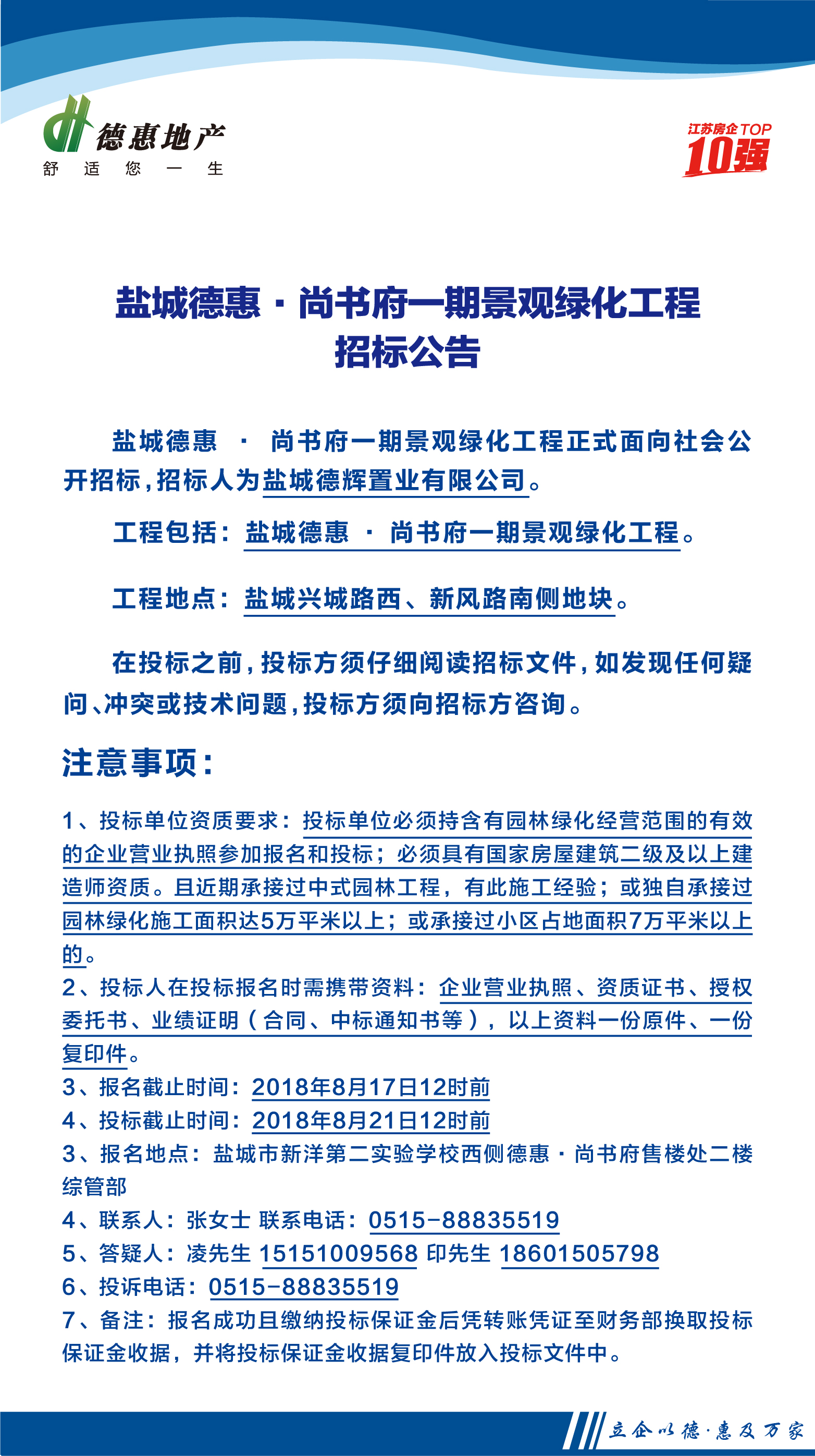 鹽城德惠·尚書(shū)府一期景觀綠化工程招標(biāo)公告