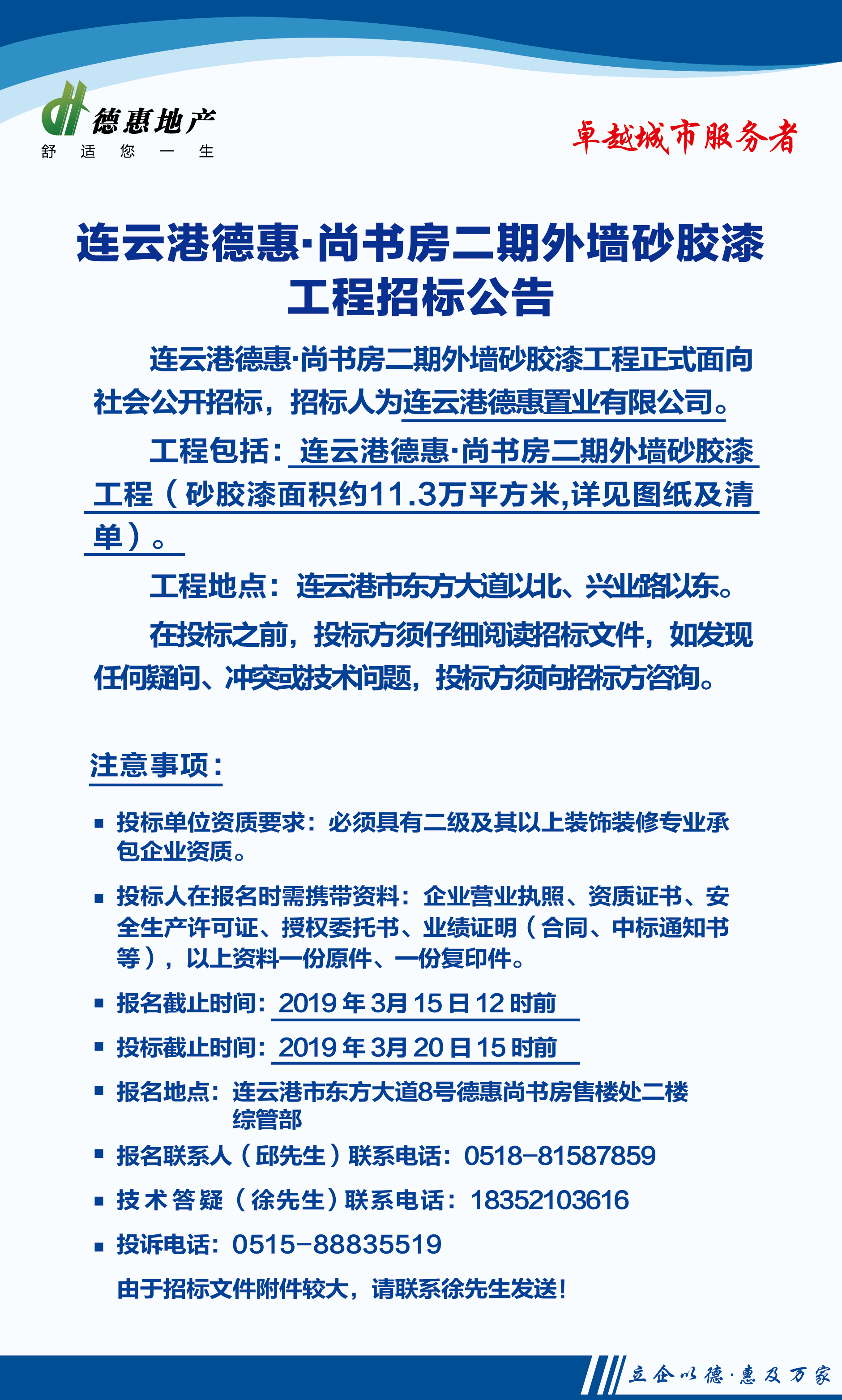 連云港德惠·尚書房二期外墻砂膠漆工程招標(biāo)公告