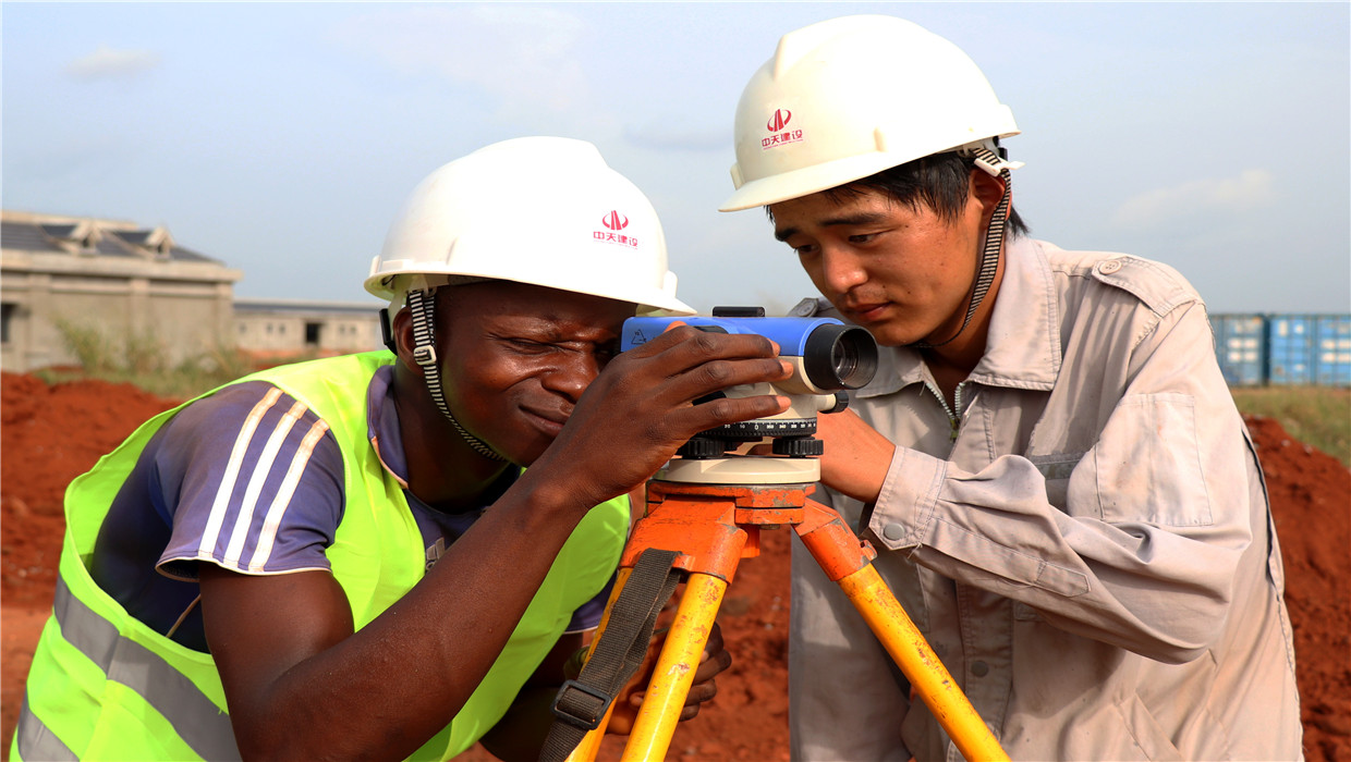貝寧測量員李和星正教他的貝寧徒弟羅蘭如何使用測量儀器?!刑旌M?/p>