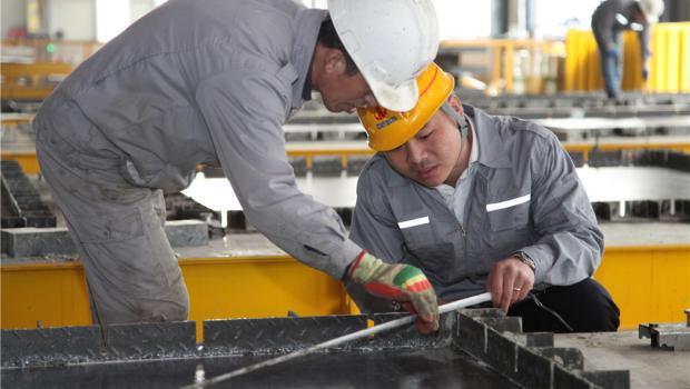 夏天的裝配式生產(chǎn)車間高溫難耐,生產(chǎn)經(jīng)理在和工人囑咐生產(chǎn)要點(diǎn)