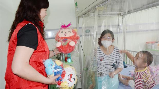 志愿者在武漢兒童醫(yī)院血液科為白血病兒童送去六一禮物