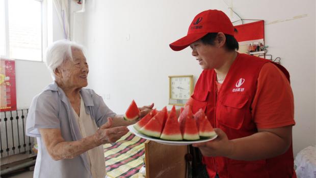 志愿者在煙臺養(yǎng)老院為老人送去夏日清涼